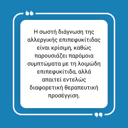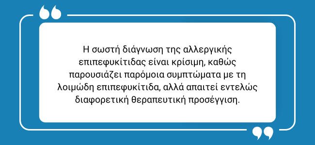 Η σωστή διάγνωση της αλλεργικής επιπεφυκίτιδας είναι κρίσιμη, καθώς παρουσιάζει παρόμοια συμπτώματα με τη λοιμώδη επιπεφυκίτιδα, αλλά απαιτεί εντελώς διαφορετική θεραπευτική προσέγγιση.