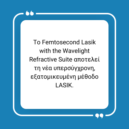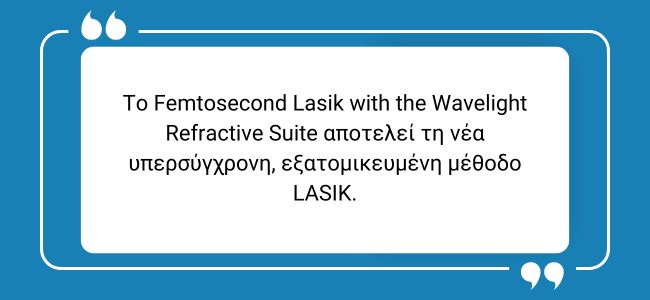 Επειδή παγκοσμίως έχουν αποδειχθεί τα άριστα, ασφαλή αποτελέσματα χρησιμοποιώντας το femtosecond laser για την δημιουργία κρημνού, η γράφουσα οφθαλμίατρος χρησιμοποιεί αποκλειστικά και μόνο femtosecond laser (Z-LASIK) τα τελευταία χρόνια. Ειδικότερα το Femtosecond Lasik with the Wavelight Refractive Suite αποτελεί τη νέα υπερσύγχρονη, εξατομικευμένη μέθοδο LASIK.