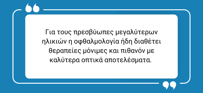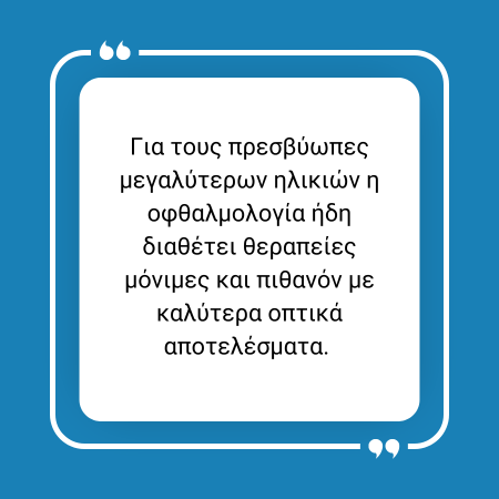 Για τους πρεσβύωπες μεγαλύτερων ηλικιών η οφθαλμολογία ήδη διαθέτει θεραπείες μόνιμες και πιθανόν με καλύτερα οπτικά αποτελέσματα.