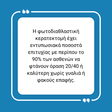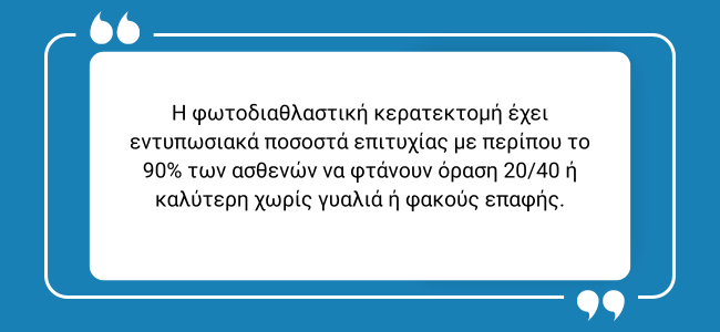 Η φωτοδιαθλαστική κερατεκτομή έχει εντυπωσιακά ποσοστά επιτυχίας με περίπου το 90% των ασθενών να φτάνουν όραση 20/40 ή καλύτερη χωρίς γυαλιά ή φακούς επαφής.